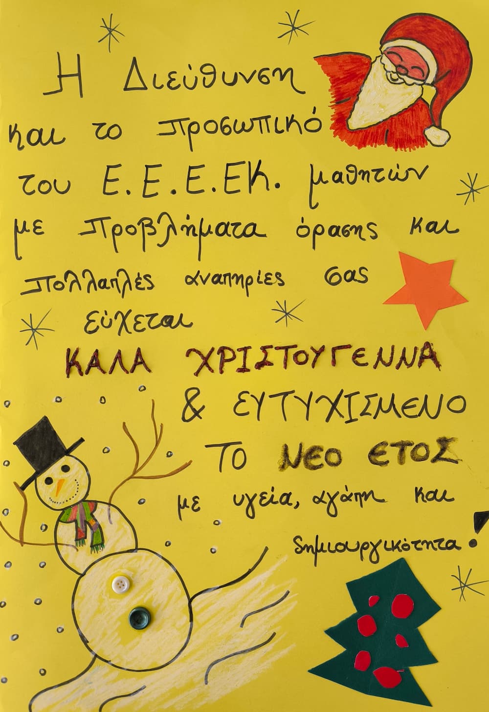 Το σχολείο μας εύχεται σε όλους τους μαθητές και τις μαθήτριες, στους γονείς και κηδεμόνες, καθώς και σε ολόκληρη την εκπαιδευτική κοινότητα, Καλά Χριστούγεννα και Ευτυχισμένο το Νέο Έτος.