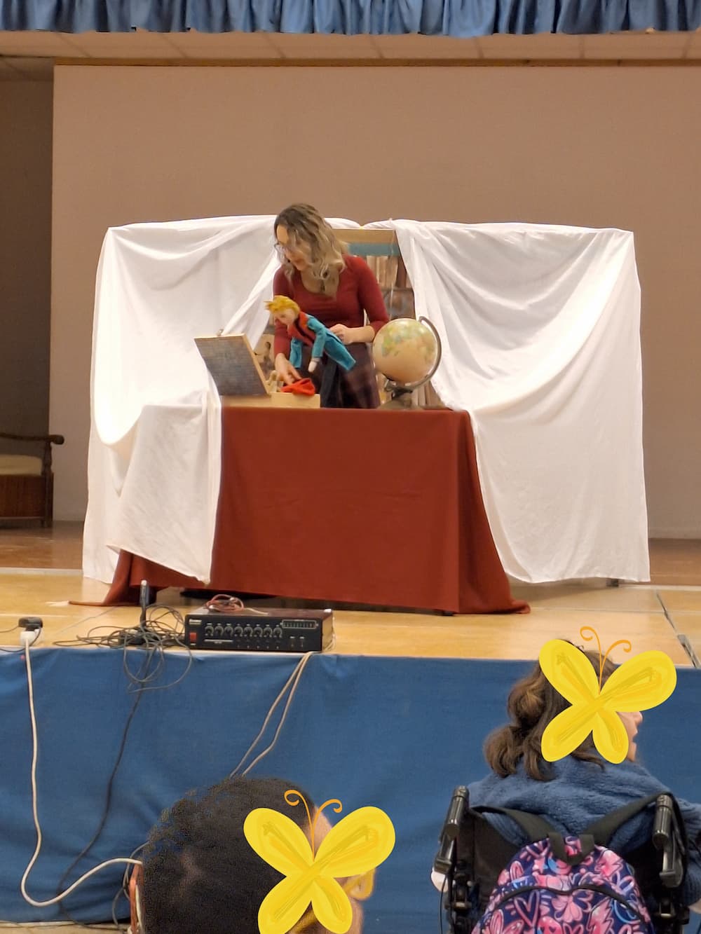 Την Παρασκευή 31 Οκτωβρίου 2025 πραγματοποιήθηκε στο αμφιθέατρο του σχολείου μας η κουκλοθεατρική παράσταση «Ταξίδι με τον Σεβάχ». Η κοινωνική λειτουργός του σχολείου μας, Σαμαρτζή Αθανασία, σε συνεργασία με την υπεύθυνη του θεάτρου κούκλας «Παραμυθοχώρα», επέλεξαν την κατάλληλη κουκλοθεατρική παράσταση για το σχολείο μας. Η ηθοποιός, κα Ηλιοπούλου Γεωργία, προσάρμοσε το παραμύθι σύμφωνα με τις ανάγκες των μαθητών μας και αλληλεπίδρασε μαζί τους. Οι μαθητές μας παρακολούθησαν την παράσταση, γέλασαν και χόρεψαν με μουσικές από όλο τον κόσμο.